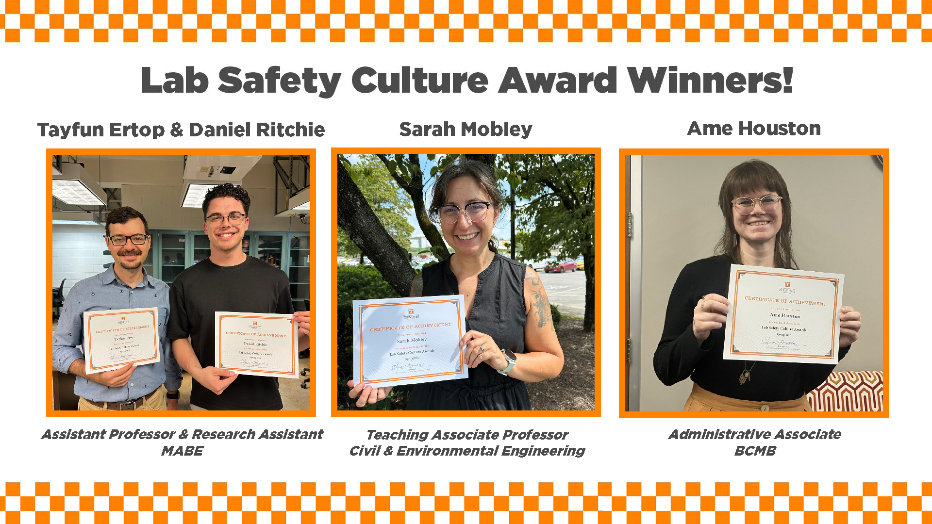New lab safety culture award categories will be announced quarterly. Submissions are open to everyone involved in research or working in a lab, shop, or maker space at UT. Announcements of new awards are sent through the Lab Safety ListServ, found on flyers around campus, and communicated during events. Please email ehs_labsafety@utk.edu to request to be added to the Lab Safety ListServ if you are not already enrolled.